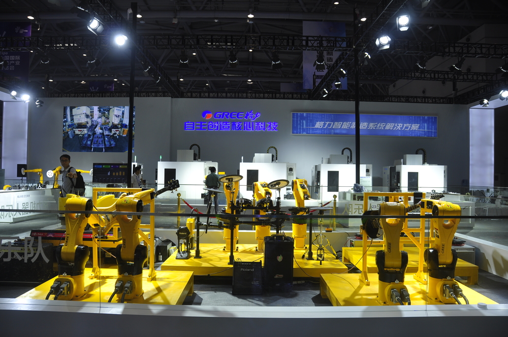? ? ? ? 如果工業(yè)化集成應(yīng)用區(qū)的展出產(chǎn)品更受智能裝備專業(yè)人士的歡迎,那么格力工業(yè)機(jī)器人樂(lè)隊(duì)則引來(lái)了眾多普通參展者的圍觀。一群外形精致,身手靈活的“小黃人”成為格力展區(qū)上的“明星”。它們有的打鼓,有的彈琴,有的在一旁用吉他、貝斯、鐘琴伴奏,一首雄壯悠揚(yáng)的《歌唱祖國(guó)》奏響于重慶智博會(huì)。