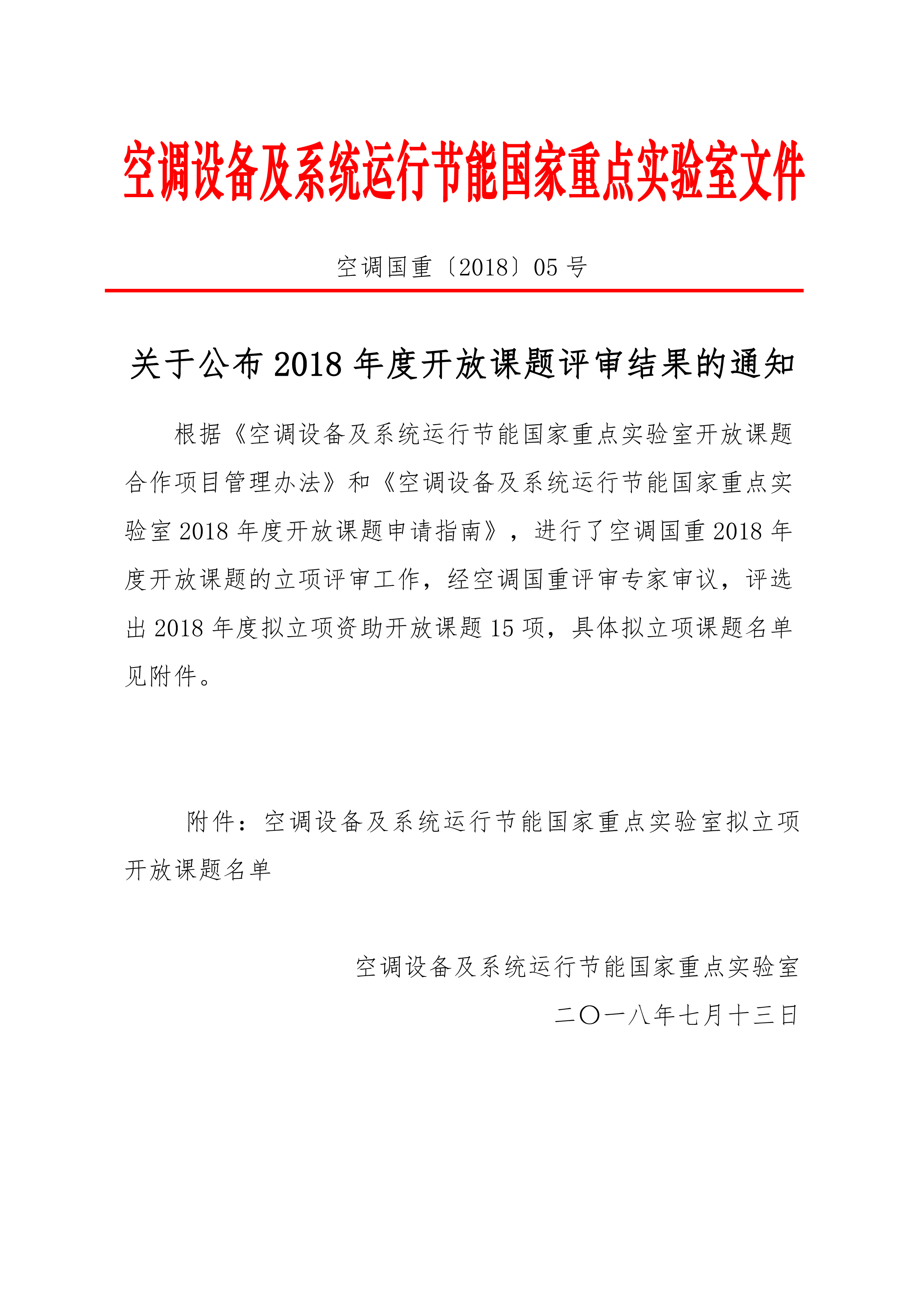 根據(jù)《空調(diào)設備及系統(tǒng)運行節(jié)能國家重點實驗室開放課題合作項目管理辦法》和《空調(diào)設備及系統(tǒng)運行節(jié)能國家重點實驗室2018年度開放課題申請指南》,進行了空調(diào)國重2018年度開放課題的立項評審工作,經(jīng)空調(diào)國重評審專家審議,評選出2018年度擬立項資助開放課題15項,具體擬立項課題名單見附件。
